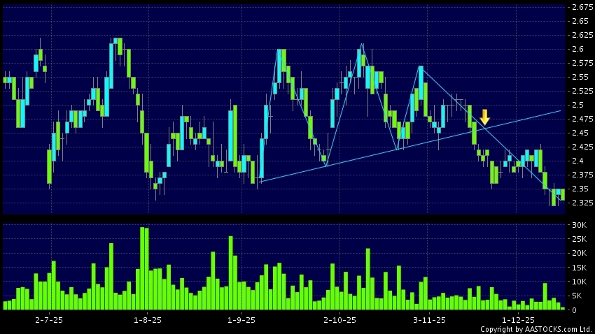 JNCEC(00579.HK)  -0.060 (-2.553%)    Short selling $276.30K; Ratio 2.729%   appears a downside breakout, dropped below the neckline. Last printed at 2.330; fell 0.851%; on volume of 958.00K shares and turnover of $2.24M