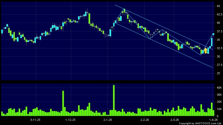 HANSOH PHARMA(03692.HK) appears an upside range breakout. Last printed at 36.940; rose 4.115%; on volume of 8.69M shares and turnover of $312.27MRecent PerformanceIn 3 days: +13.45...