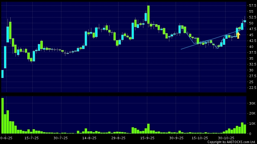 ZHOU LIU FU(06168.HK)  0.000 (0.000%)   appears an upside breakout, rose above the neckline. Last printed at 51.200; rose 2.400%; on volume of 9.03M shares and turnover of $453.66M