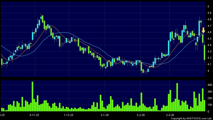 华电国际电力股份(01071.HK) -0.250 (-5.631%) 沽空 $7.38百万; 比率 6.847% 10天移动平均线跌穿20天移动平均线,出现死亡交叉。现价报4.170,下跌6.081%,成交量1.73千万股,成交额7.26千万。