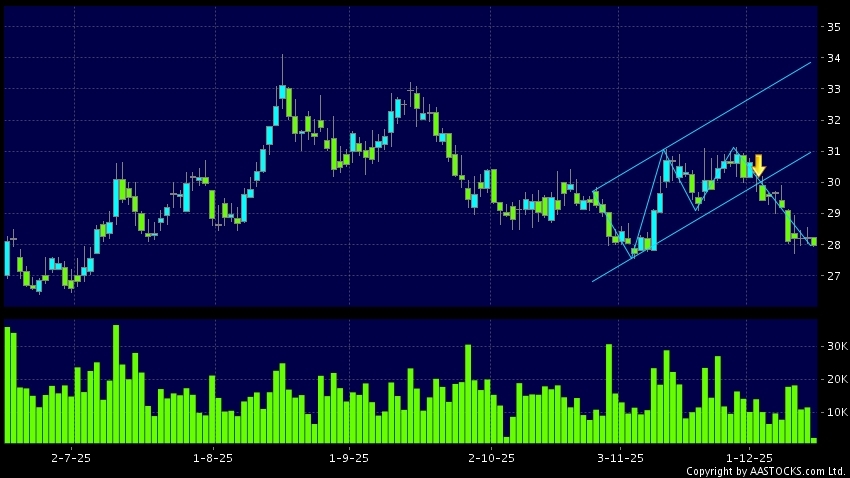 区域突破指股价在过去的一段时间只在一个范围在内活动,然後股价下跌作出突破,跌穿区域的底部,技术走势偏软。(港股报价延迟最少十五分钟。沽空资料截至 2025-12-15 16:25。)