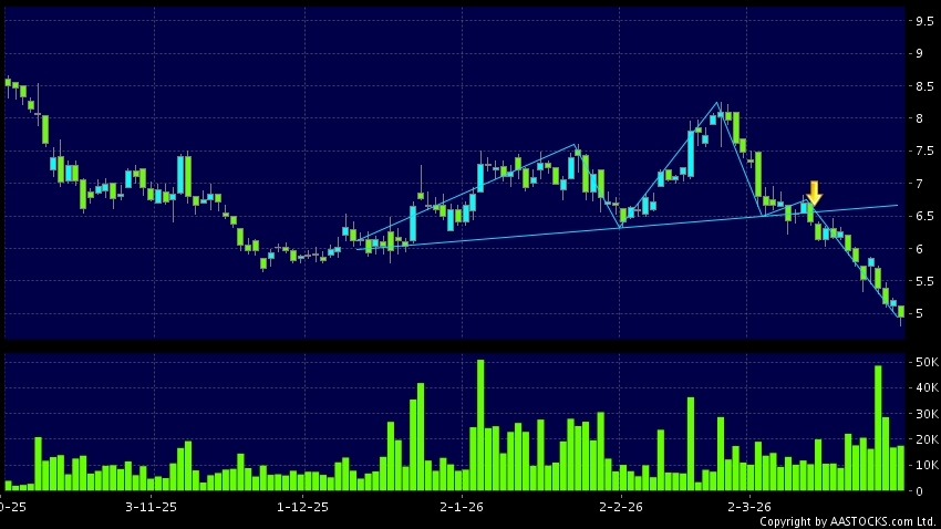 头肩顶是典型的沽出讯号,当股价跌穿支持线(颈线)时,跌势确认股价将持续下跌,技术走势偏软。(港股报价延迟最少十五分钟。沽空资料截至 2026-03-30 16:25。)