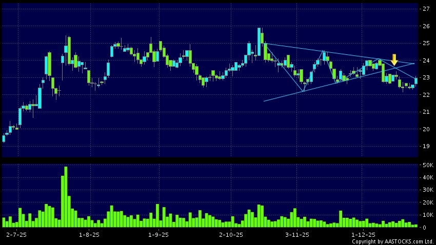 三角形向下突破是指股價的波幅漸漸收窄,在圖表上形成三角形般的狀態。股價在三角形的末端向下突破,下跌趨勢形成,技術走勢偏軟。(港股報價延遲最少十五分鐘。沽空資料截至 2025-12-31 12:25。)