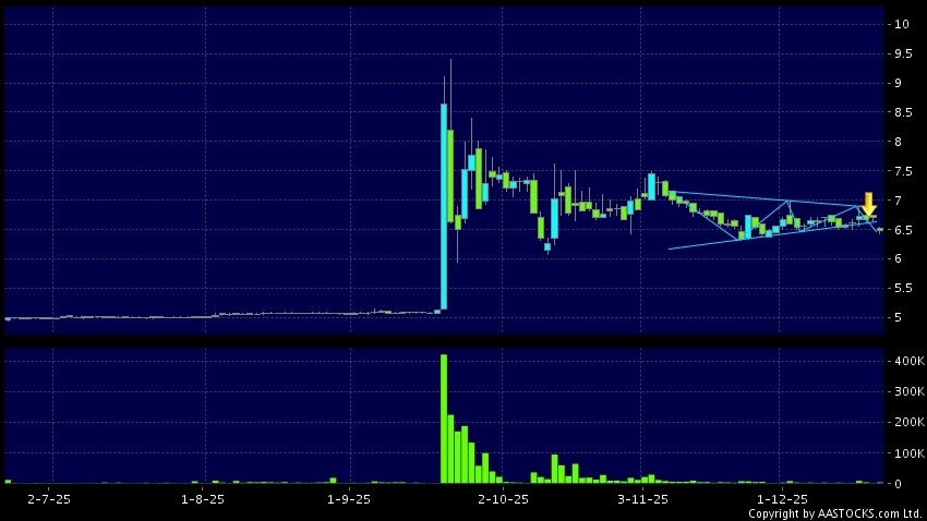三角形向下突破是指股價的波幅漸漸收窄,在圖表上形成三角形般的狀態。股價在三角形的末端向下突破,下跌趨勢形成,技術走勢偏軟。(港股報價延遲最少十五分鐘。沽空資料截至 2025-12-31 12:25。)