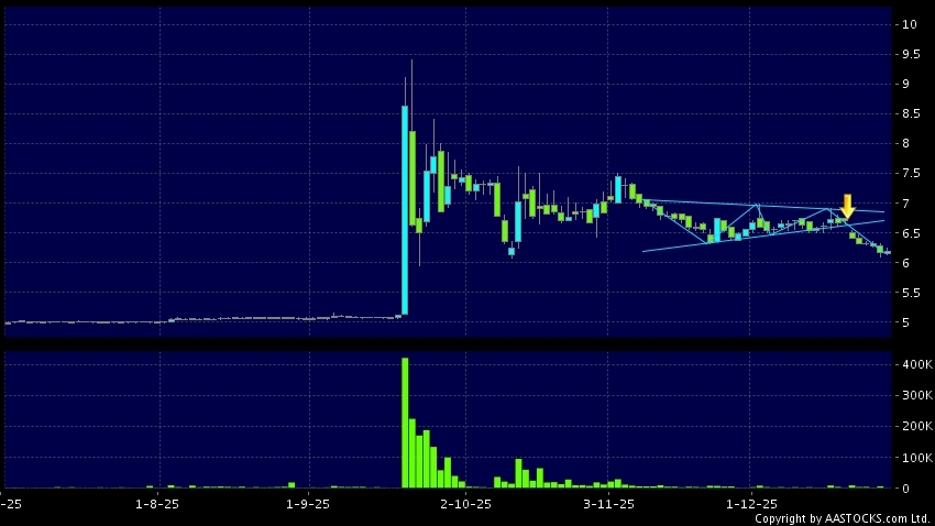 三角形向下突破是指股價的波幅漸漸收窄,在圖表上形成三角形般的狀態。股價在三角形的末端向下突破,下跌趨勢形成,技術走勢偏軟。(港股報價延遲最少十五分鐘。沽空資料截至 2025-12-31 12:25。)