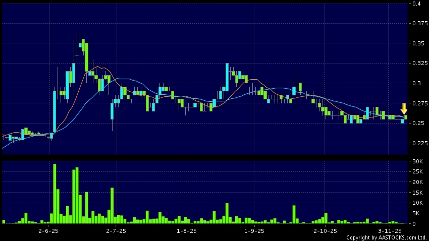 羚邦集團(02230.HK) -0.004 (-1.639%) 10天移動平均線跌穿20天移動平均線,出現死亡交叉。現價報0.255,無升跌,成交量4.50萬股,成交額1.17萬。