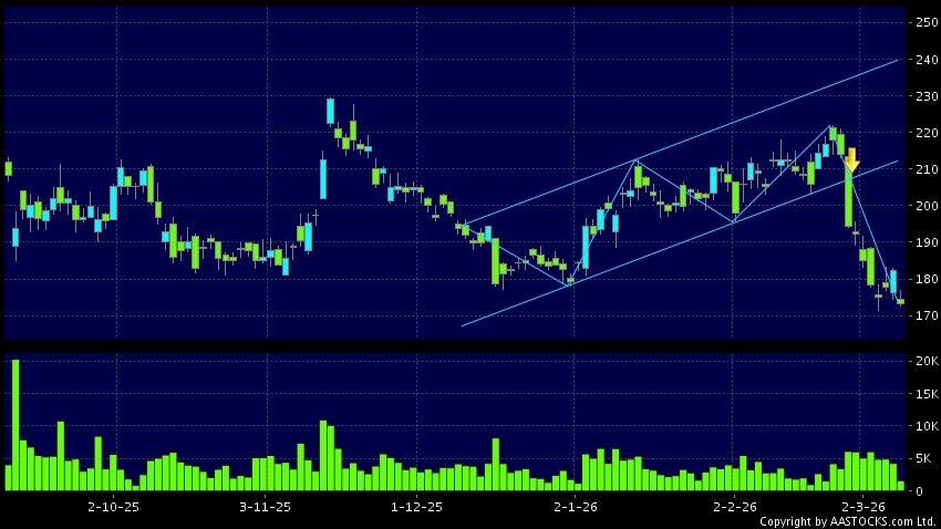 區域突破指股價在過去的一段時間只在一個範圍在內活動,然後股價下跌作出突破,跌穿區域的底部,技術走勢偏軟。(港股報價延遲最少十五分鐘。沽空資料截至 2026-03-09 16:25。)