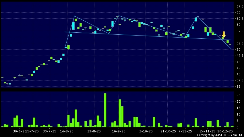 頭肩頂是典型的沽出訊號,當股價跌穿支持線(頸線)時,跌勢確認股價將持續下跌,技術走勢偏軟。(港股報價延遲最少十五分鐘。沽空資料截至 2025-12-16 16:25。)