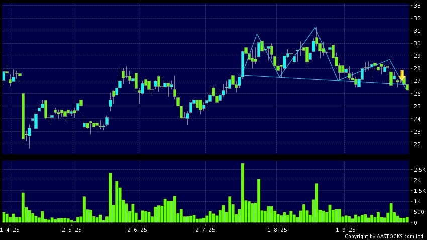 昊海生物科技(06826.HK) +0.200 (+0.743%) 呈現頭肩頂向下突破。現價報26.260,下跌1.868%,成交量27.11萬股,成交額7.16百萬。