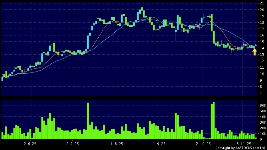 諾誠健華(09969.HK) +0.520 (+3.567%) 沽空 $3.80千萬; 比率 23.677% 10天移動平均線升穿20天移動平均線,出現黃金交叉。現價報14.430,上升0.698%,成交量2.91百萬股,成交額4.23千萬。