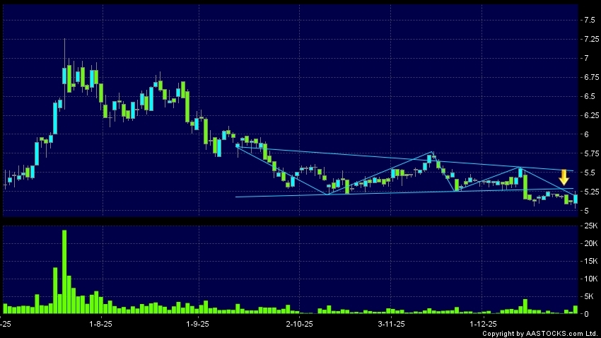 三角形向下突破是指股價的波幅漸漸收窄,在圖表上形成三角形般的狀態。股價在三角形的末端向下突破,下跌趨勢形成,技術走勢偏軟。(港股報價延遲最少十五分鐘。沽空資料截至 2026-01-02 12:25。)