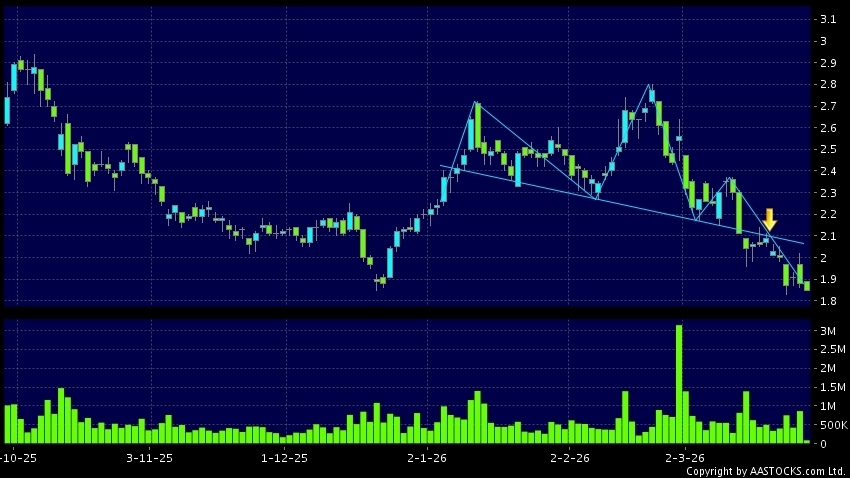 Head Shoulders top is a typical bearish signal, when stock price breaks the supportive level, downtrend would possibly start.(HK stocks quote is delayed for at least 15 mins.Short Selling Data as at 2026-03-26 16:25.)