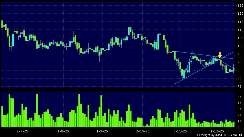 Triangle Breakout means the volatility of price movement is decreasing, stock price finally broke the bottom of triangle. A downward trend will start.(HK stocks quote is delayed for at least 15 mins.Short Selling Data as at 2025-12-12 16:25.)
