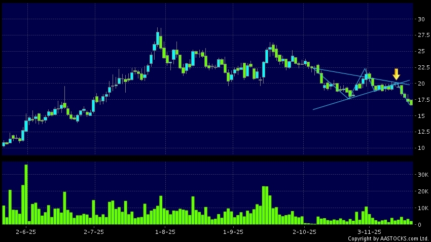 Triangle Breakout means the volatility of price movement is decreasing, stock price finally broke the bottom of triangle. A downward trend will start.(HK stocks quote is delayed for at least 15 mins.Short Selling Data as at 2025-12-12 16:25.)