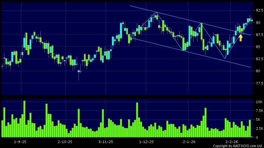 區域突破指股價在過去的一段時間只在一個範圍在內活動,然後股價上升作出突破,升穿區域的頂部,技術走勢向好。(港股報價延遲最少十五分鐘。沽空資料截至 2026-02-25 16:25。)