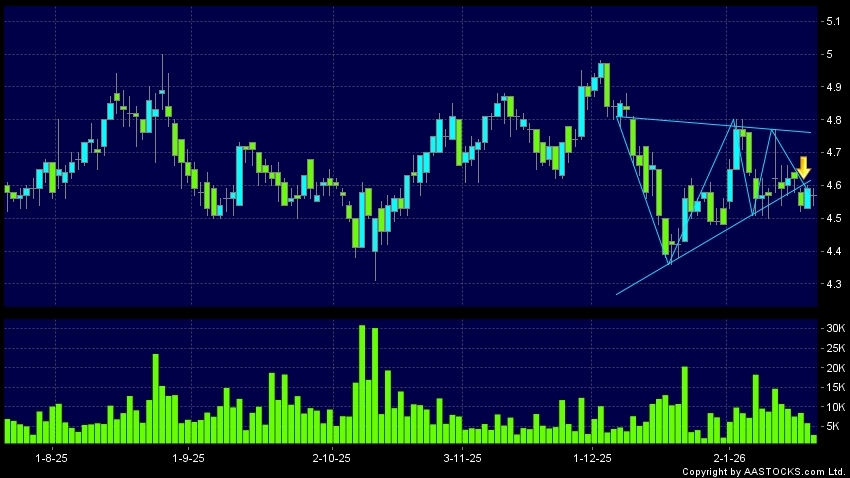 三角形向下突破是指股價的波幅漸漸收窄,在圖表上形成三角形般的狀態。股價在三角形的末端向下突破,下跌趨勢形成,技術走勢偏軟。(港股報價延遲最少十五分鐘。沽空資料截至 2026-01-29 16:25。)