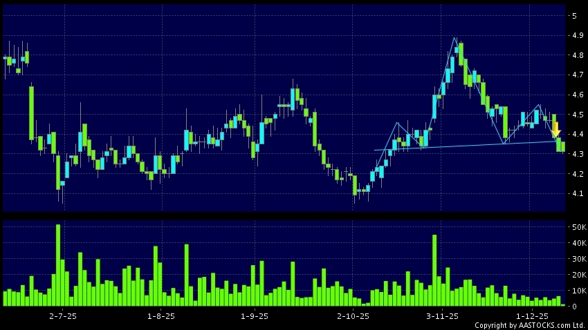 頭肩頂是典型的沽出訊號,當股價跌穿支持線(頸線)時,跌勢確認股價將持續下跌,技術走勢偏軟。(港股報價延遲最少十五分鐘。沽空資料截至 2025-12-12 16:25。)