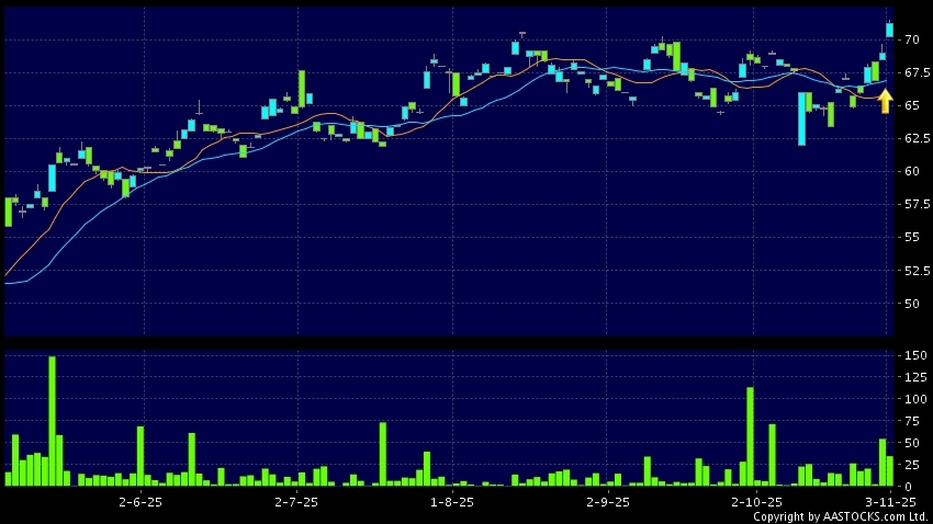 友邦保險-R(81299.HK) +4.000 (+5.797%) 沽空 $17.20萬; 比率 3.543% 10天移動平均線升穿20天移動平均線,出現黃金交叉。現價報71.300,上升3.333%,成交量3.44萬股,成交額2.46百萬。