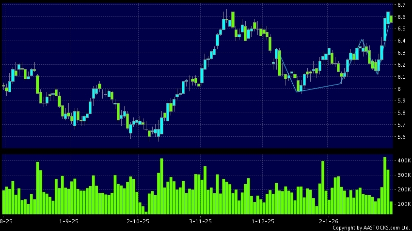 免責聲明:以上金融市場數據、報價、圖表 及/或各種技術分析指標乃根據公開資料分析和演釋自動生成的,僅作參考使用。此類自動生成的內容並不代表AASTOCKS.com Limited的立場。AASTOCKS.com Limited並不保證其準確性、完整性、實時性或者正確性。閣下應諮詢獨立專業意見,以核實定價資料或獲取更詳細的市場信息及須為所有跟隨此類自動生成的內容執行的交易或使用該內容負責。