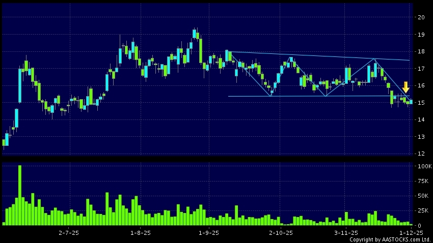 三角形向下突破是指股價的波幅漸漸收窄,在圖表上形成三角形般的狀態。股價在三角形的末端向下突破,下跌趨勢形成,技術走勢偏軟。(港股報價延遲最少十五分鐘。沽空資料截至 2025-12-12 16:25。)