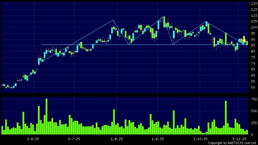 信達生物(01801.HK)呈現頭肩頂向下突破。現價報85.200,下跌3.511%,成交量1.01千萬股,成交額8.68億。最近表現:3日 -1.900%5日 -2.069%10日 +0.118%最...