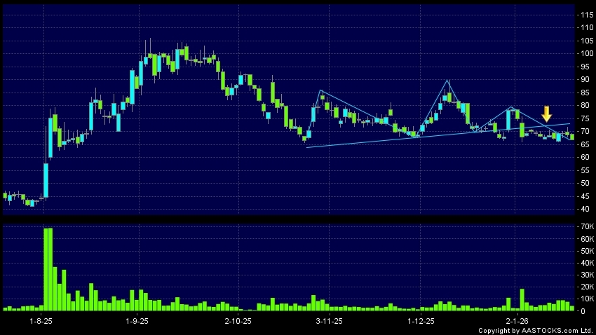 頭肩頂是典型的沽出訊號,當股價跌穿支持線(頸線)時,跌勢確認股價將持續下跌,技術走勢偏軟。(港股報價延遲最少十五分鐘。沽空資料截至 2026-01-28 16:25。)
