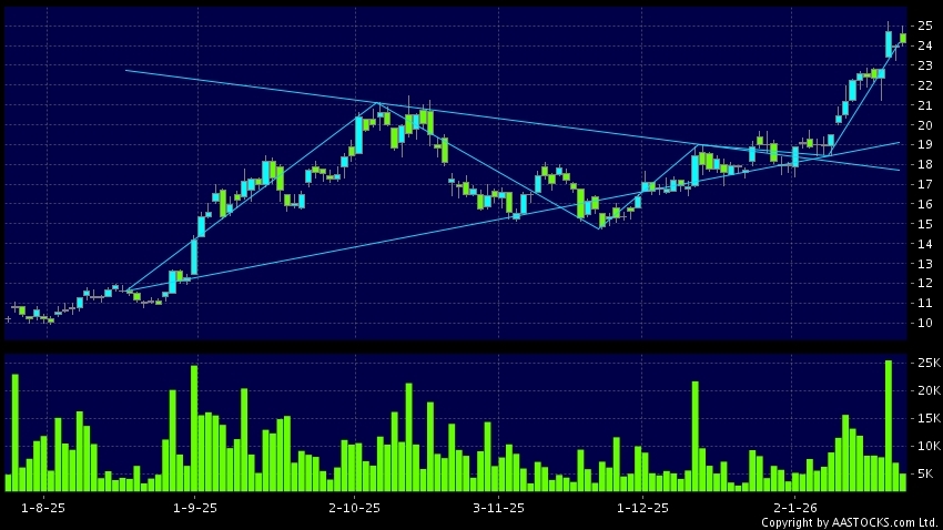 三角形向上突破是指股價的波幅漸漸收窄,在圖表上形成三角形般的狀態。股價在三角形的末端向上突破,形成上升趨勢,技術走勢向好。(港股報價延遲最少十五分鐘。沽空資料截至 2026-01-28 16:25。)