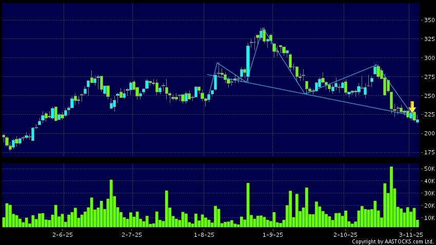 泡泡瑪特(09992.HK)呈現頭肩頂向下突破。現價報218.400,上升0.460%,成交量8.16百萬股,成交額17.87億。最近表現:3日 -1.444%5日 -4.294%10日 -12.78...